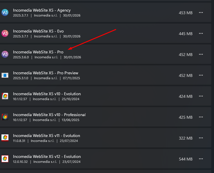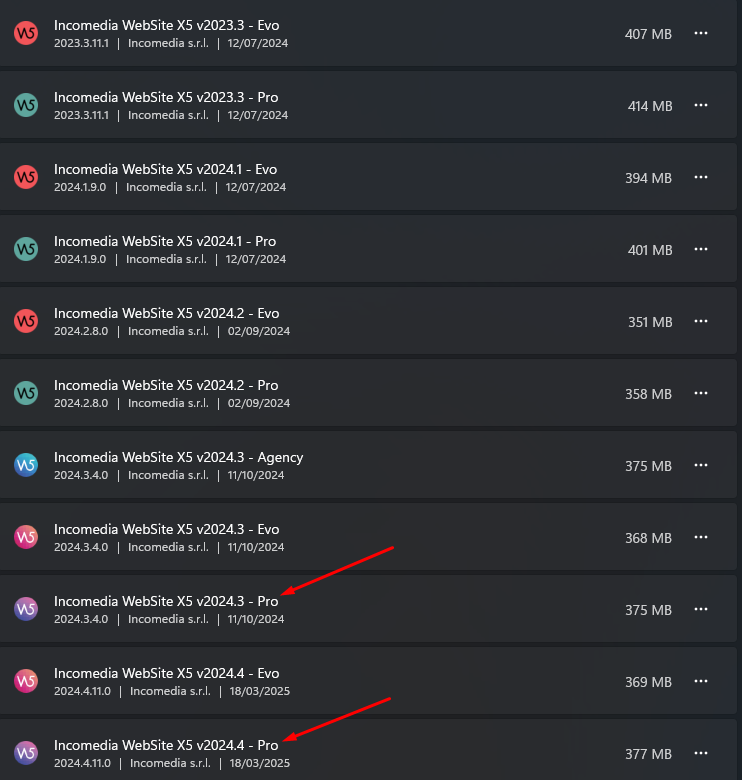 In your case, the item called only "WebSite X5 - Pro" should show 2025.1 as the version, and you should have WebSite X5 v2022.3 - Pro and WebSite X5 v2024.4 - Pro