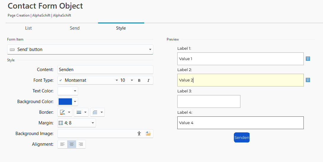 What settings have you used in the Style section for the Send button?