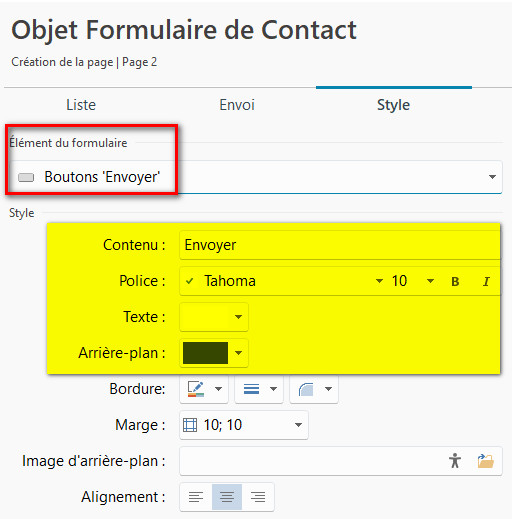 Quels paramètres avez-vous utilisés dans la section Style pour le bouton Envoyer ?