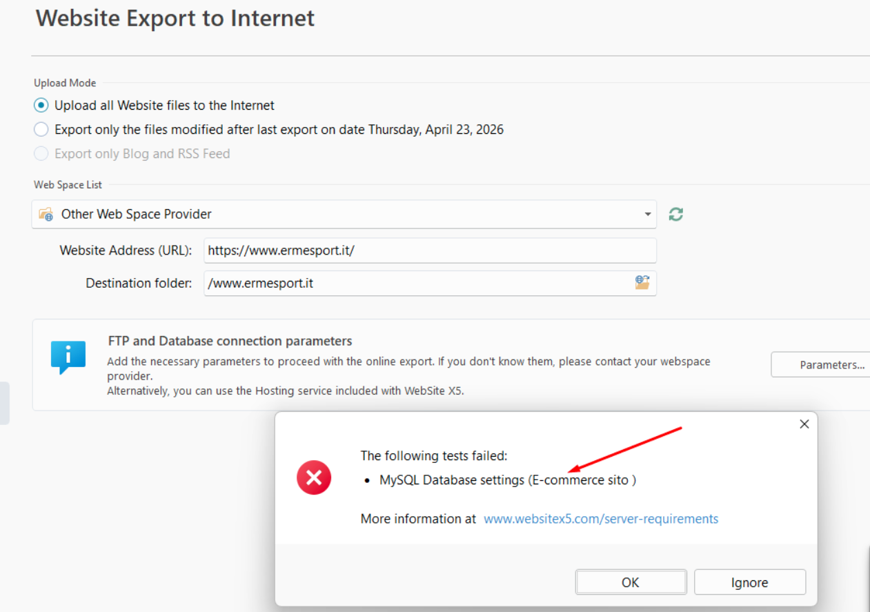 ho riverificato la pagina e il progetto, e risulta presente un errore di connessione al database, che risulta apparire anche quando si tenta un'esportazione:
